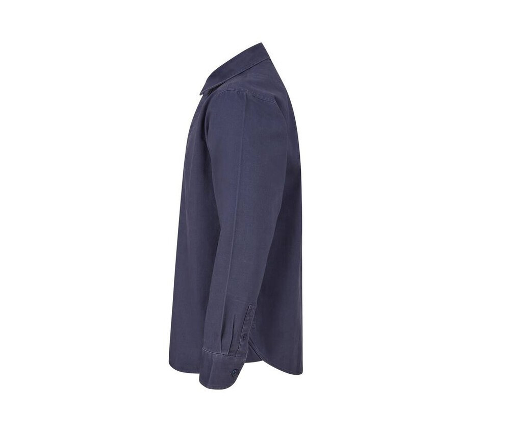Long sleeved plain drill shirt. Pullover with concealed button fastenings. Heavy garment wash. Adjustable button cuff and placket. Shaped hem. Back neck hanging loop. Back neck buggy. Self fabric vent inserts. Tag Free for easy re-branding.